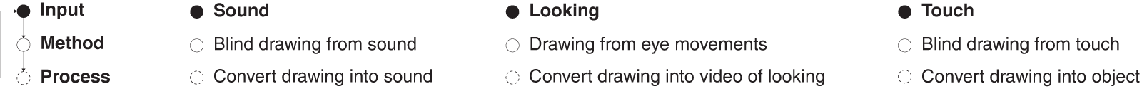 Three specific systems were formulated, a sound based system, a touch based system and a looking based system. The systems utilised a recursive method, whereby the results of a drawing are looped back through the process to create the next drawing.