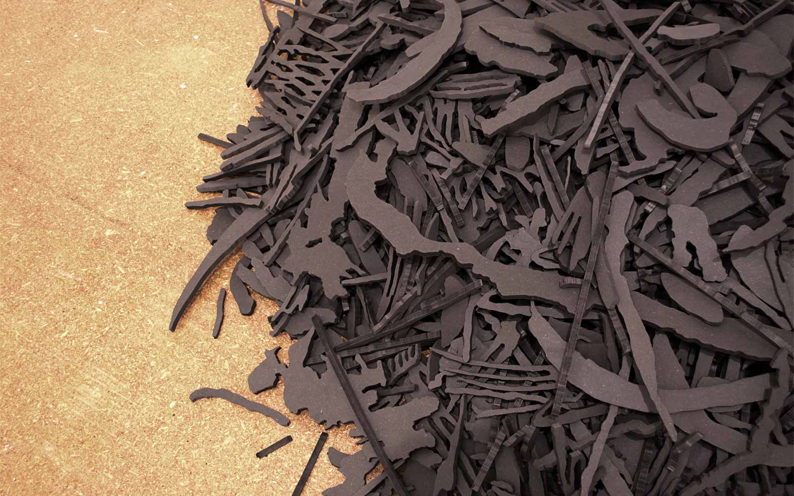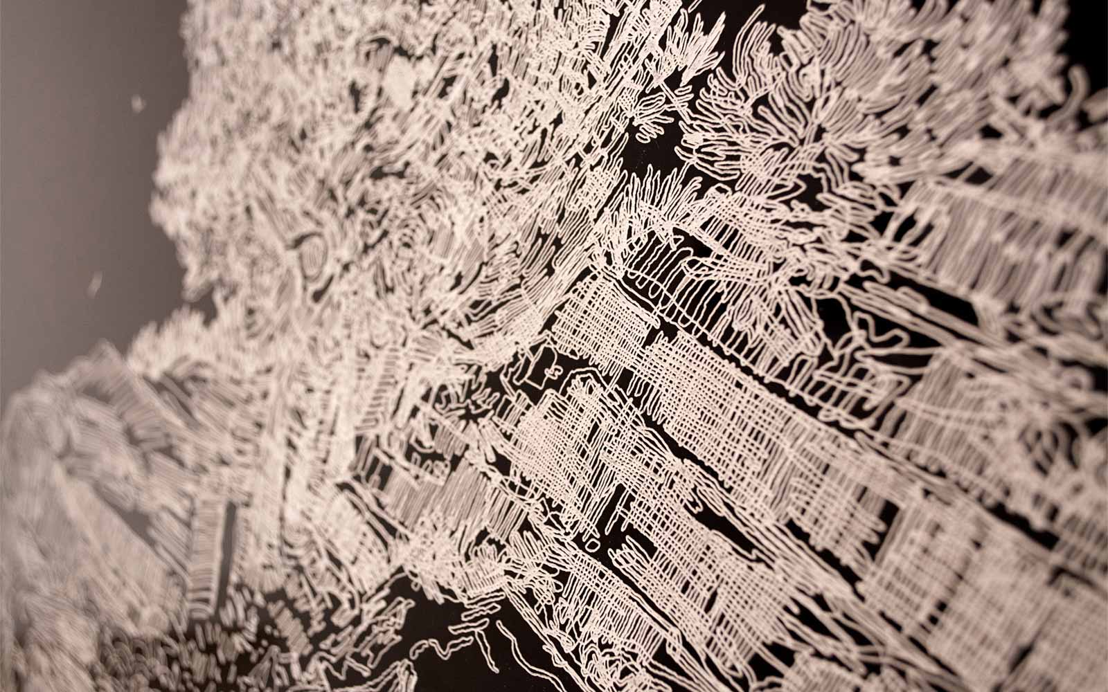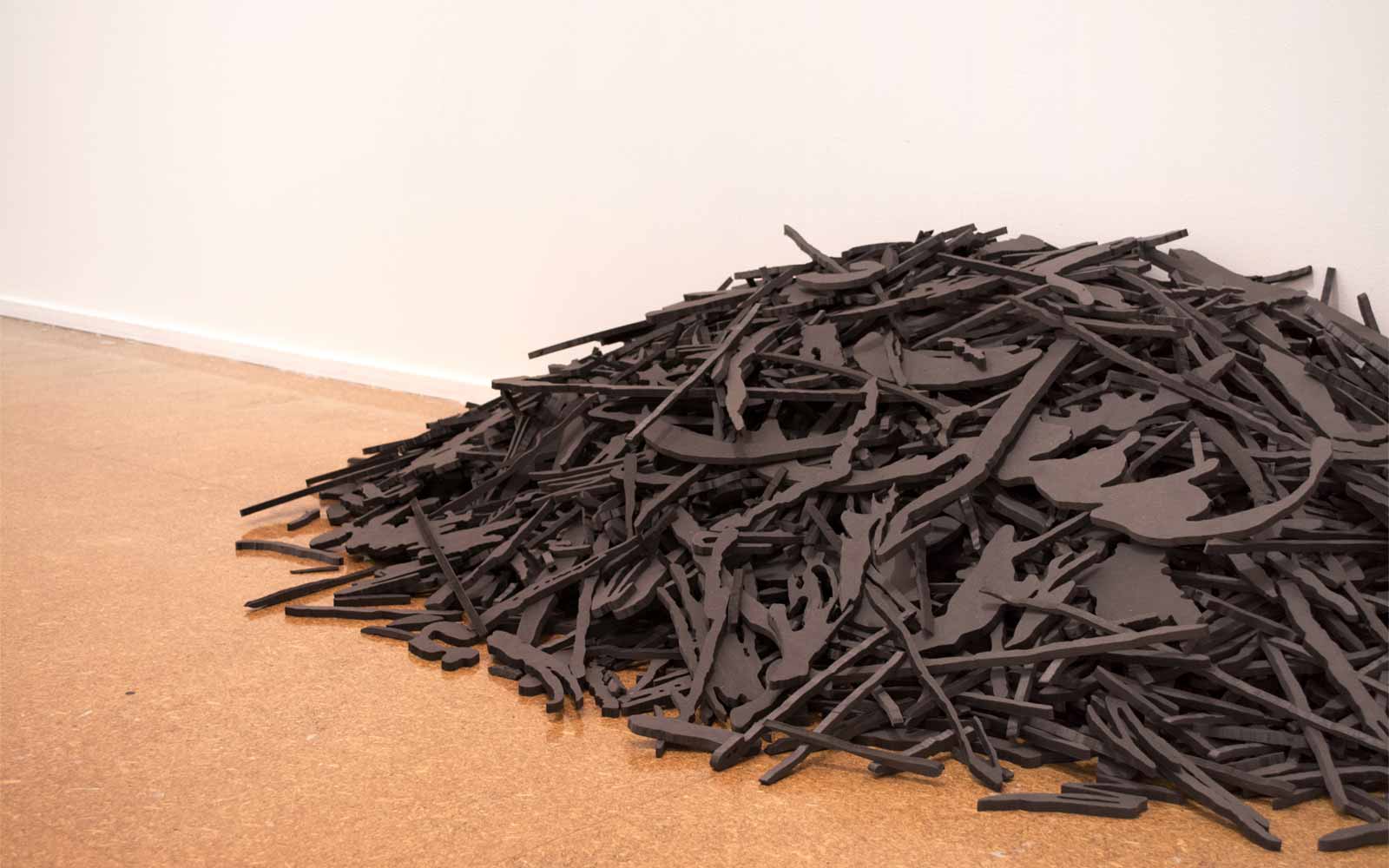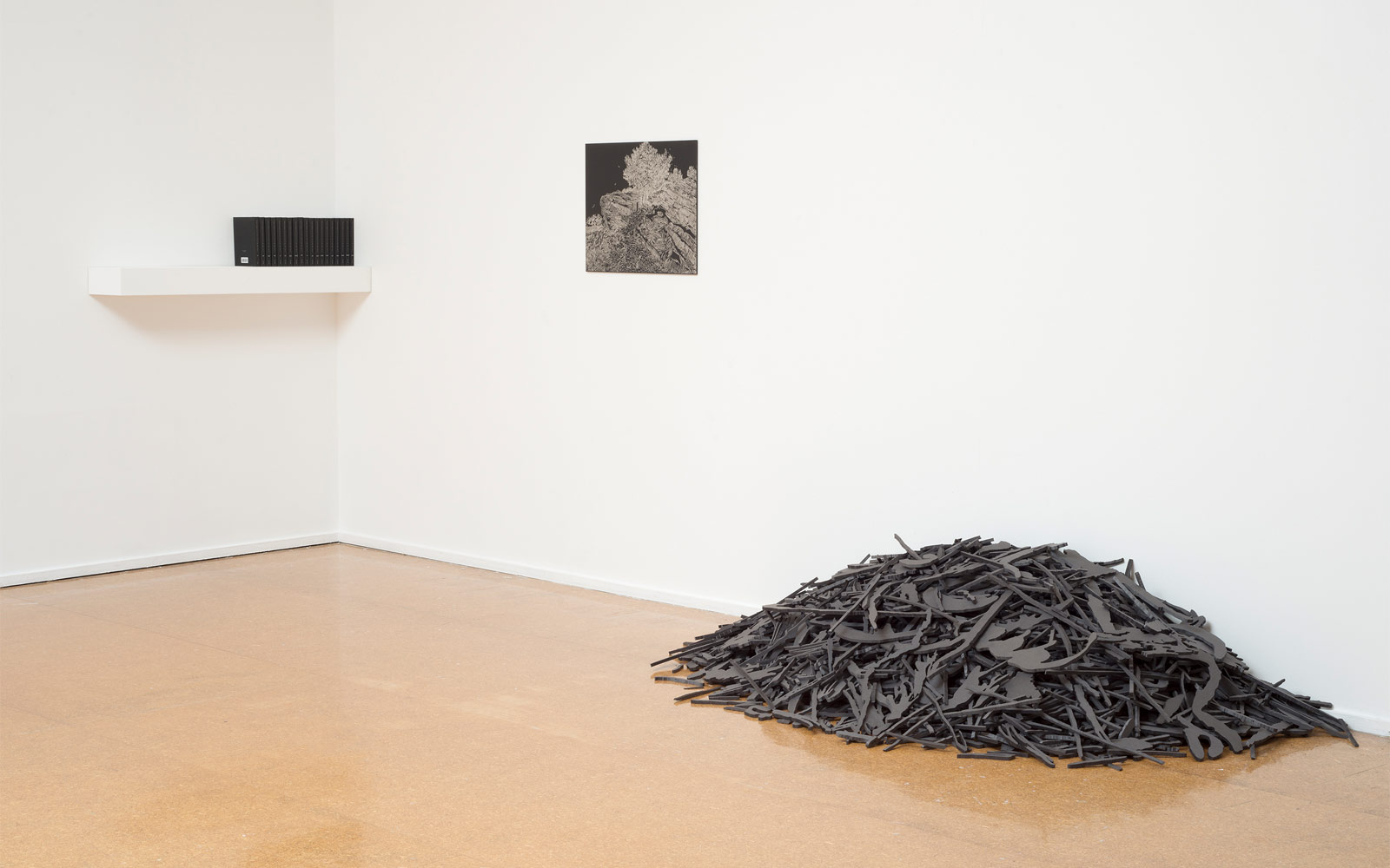 is a body of work comprised of one laser etching, 19 books and one floor sculpture. Using the Vincent van Gogh drawing from 1888, each mark was redrawn(7451), tracing the exterior of the original notations and reorganising them into new forms.